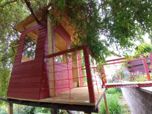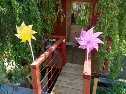 Diance se výtvor moc líbí. Gauč tvořen několika polštáři je skvělý na osedávání každého centimetru. Dál tam má ponk, kde může tvořit, několik polic na hračky, terasu s židlí a stolečkem, kde může svačit, a velká okna na pozorování světa. Do domečku vede pohodlný most (máme kaskádovou zahradu), pod domečkem visí houpací síťová židle a boxovací pytel. Až Dianka vyroste, může se přidělat žebřík či horolezecká stěna a dlouhá skluzavka.