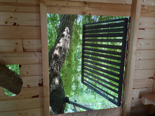 Jen ta okna byla vlastně jen díra ven. Při dešti to nebylo moc praktické. Rychlé řešení mi Dianka neocenila - přes napevno přidělaný igelit nemohla koukat ven na všechny strany. Hned do toho bouchala, aby se probojovala ven. Tak jsem jel nakoupit další dřevo a vyrobil otevírací okenice. Za dva dny znovu pršelo a skvělé, fungují! Domeček dál větrá, je vidět ven i se zavřenými okenicemi, a přesto dovnitř neprší. Až na malý detail - velký vítr okenice otevřel. :D